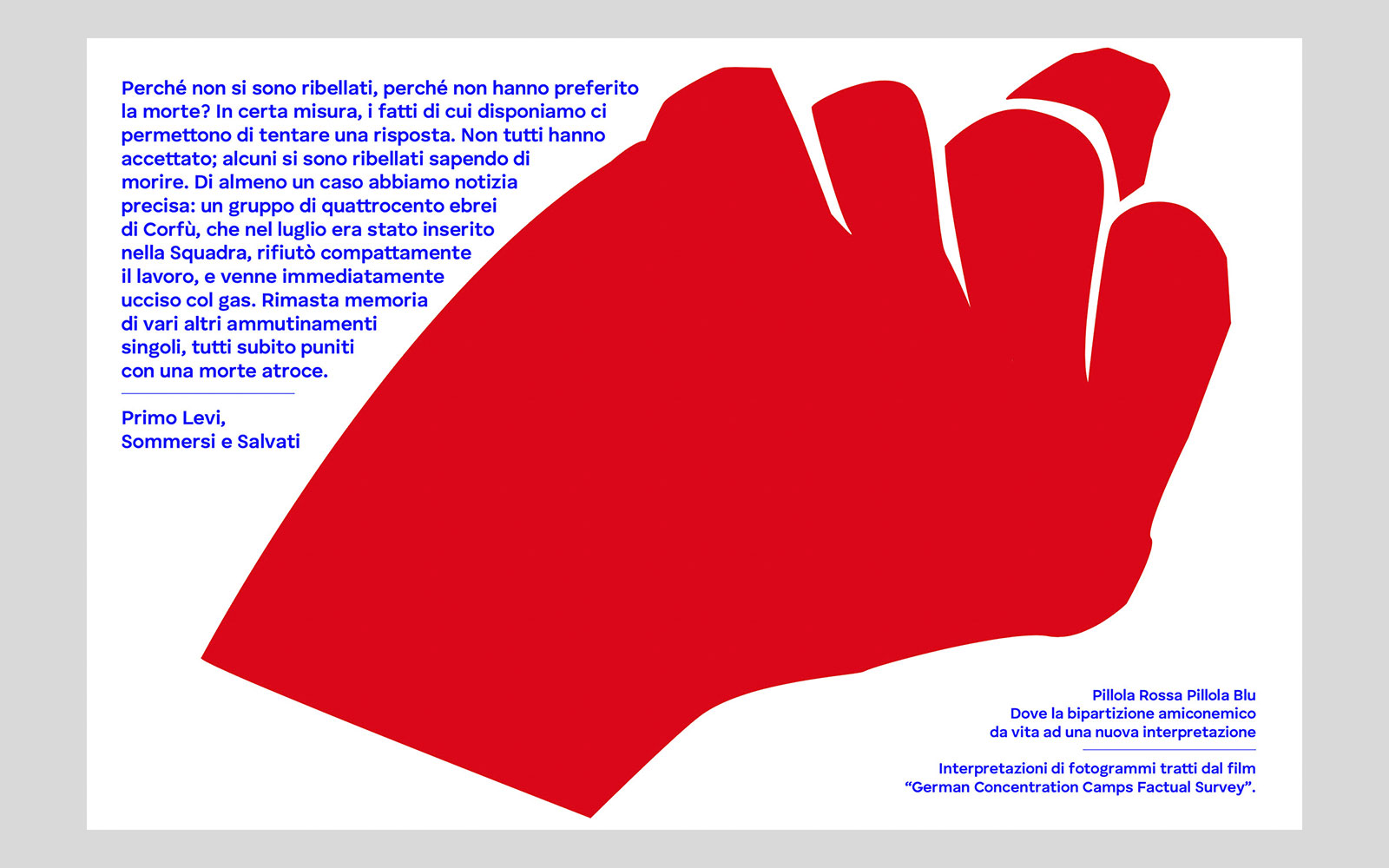 L’obbiettivo è quello di porre davanti colui che guarda una serie di mani, appartenenti a coloro che sono sopravvissuti nei lager, questo perché abbiamo notato come le foto cruente, in cui i soggetti sono persone prive di vita, non riescano a far soffermare particolarmente chi guarda data la ripetitività a cui siamo ormai abituati. Le immagini che presentiamo, non avendo un chiaro contesto, spingono infatti l’osservatore a riflettere, lasciando immaginare a quali gesti esse conducano, con lo scopo di far sì che chi osserva colga individualmente il messaggio e permetta di ricevere un maggiore impatto sul tema.